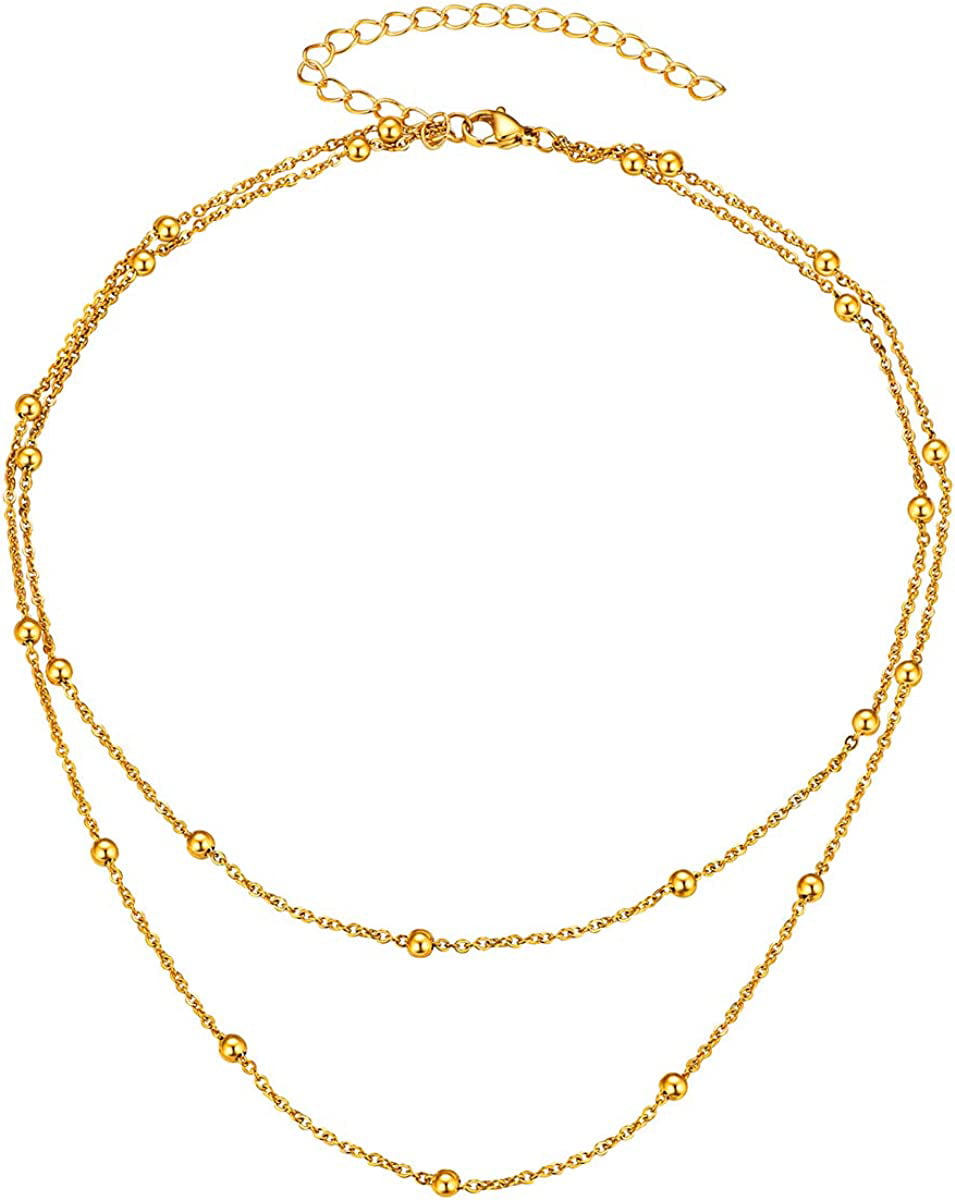 FOCALOOK Beaded Necklace Choker Chain Double Layered Necklace 18K Gold Plated Metal Boho Necklaces for Women Teen Girls