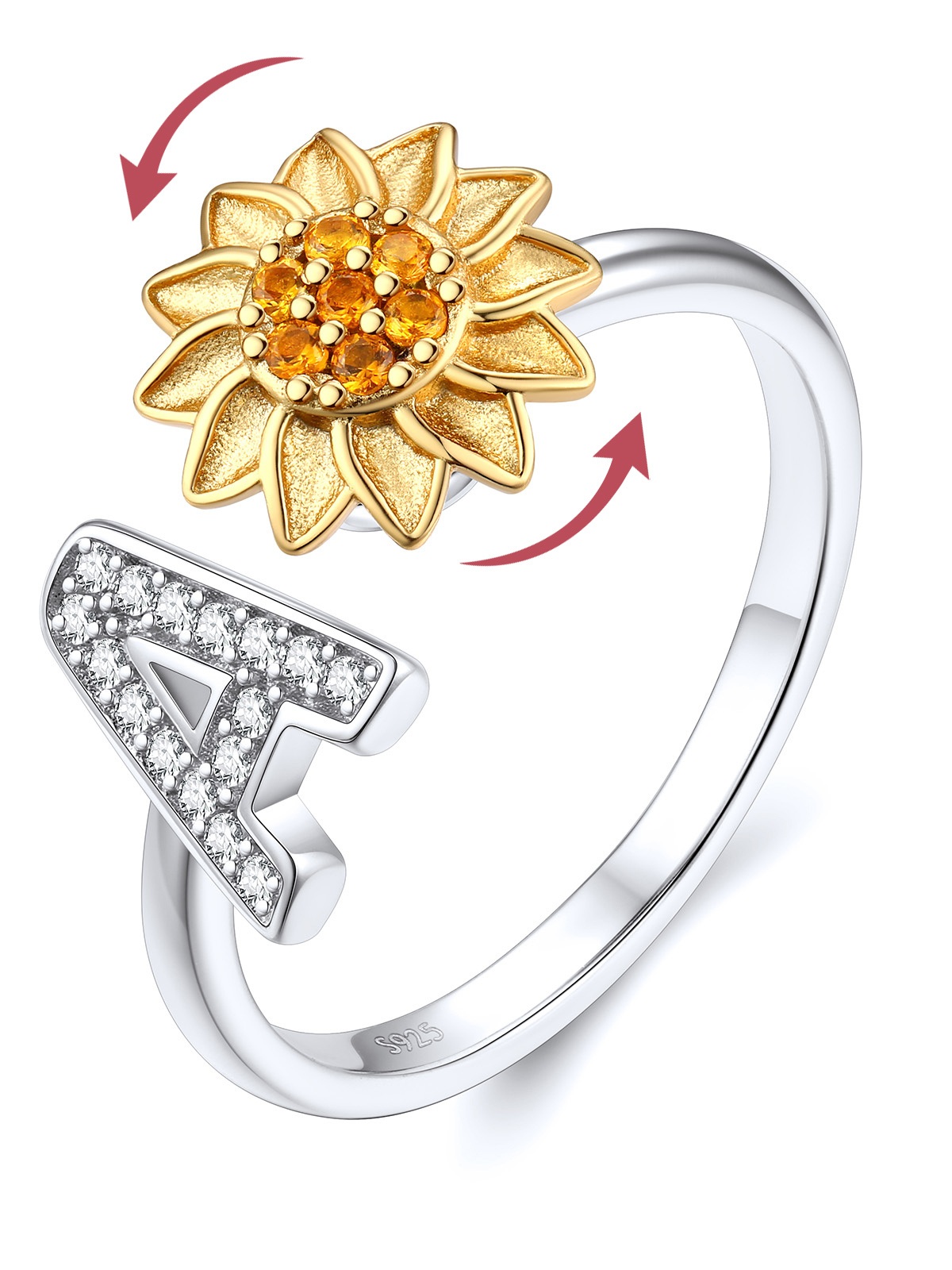 FOCALOOK Rotatable Sunflower Fidget Ring for Women 925 Sterling Silver Anxiety Ring Adjustable Open Spinner Ring Cubic Zirconia Initial A Rings Jewelry Gift