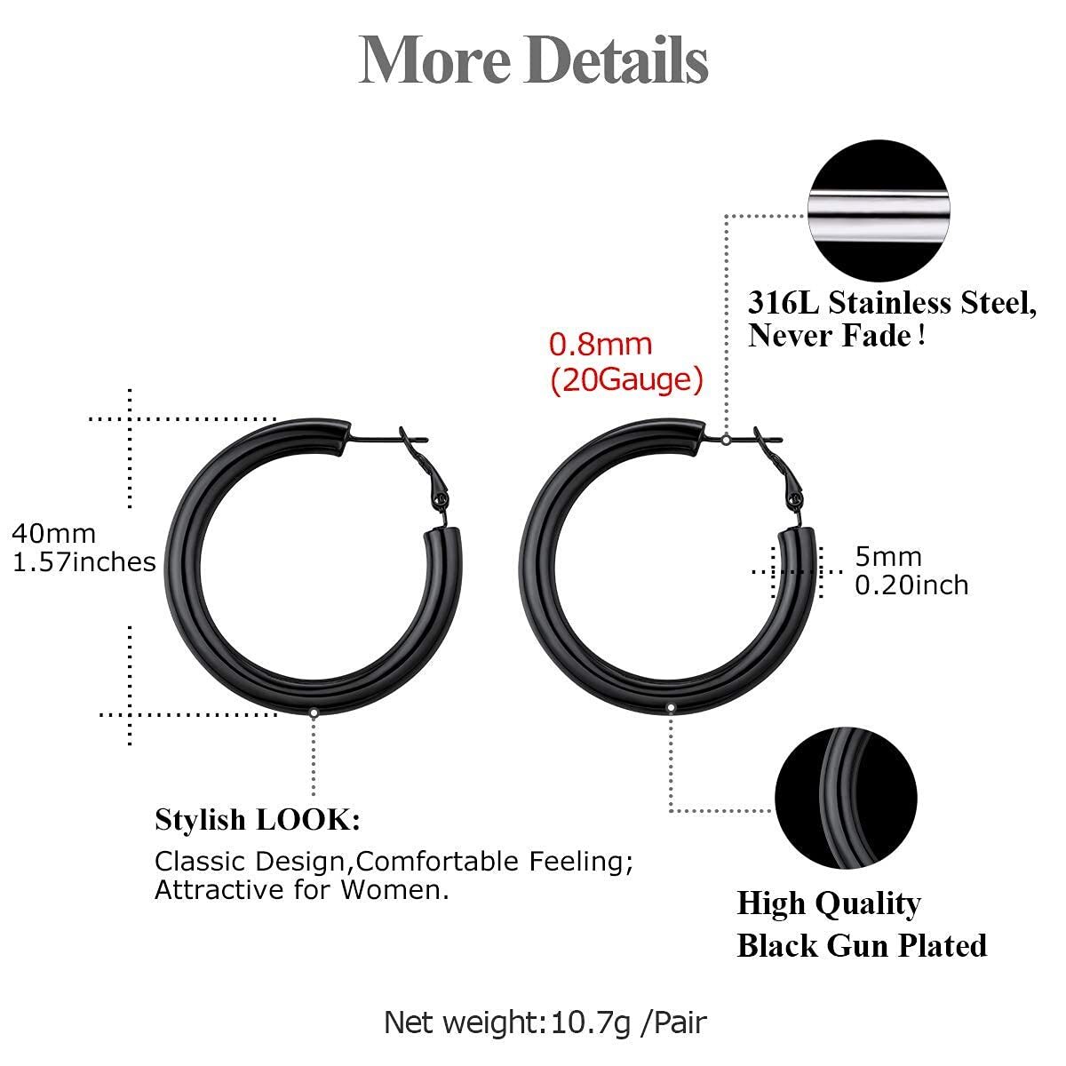 - Hypoallergenic Material: These black hoop earrings are made of high quality 316L stainless steel. Nickel-free and lead-free, resist rust and resist corrode, ensure to use for a long time.