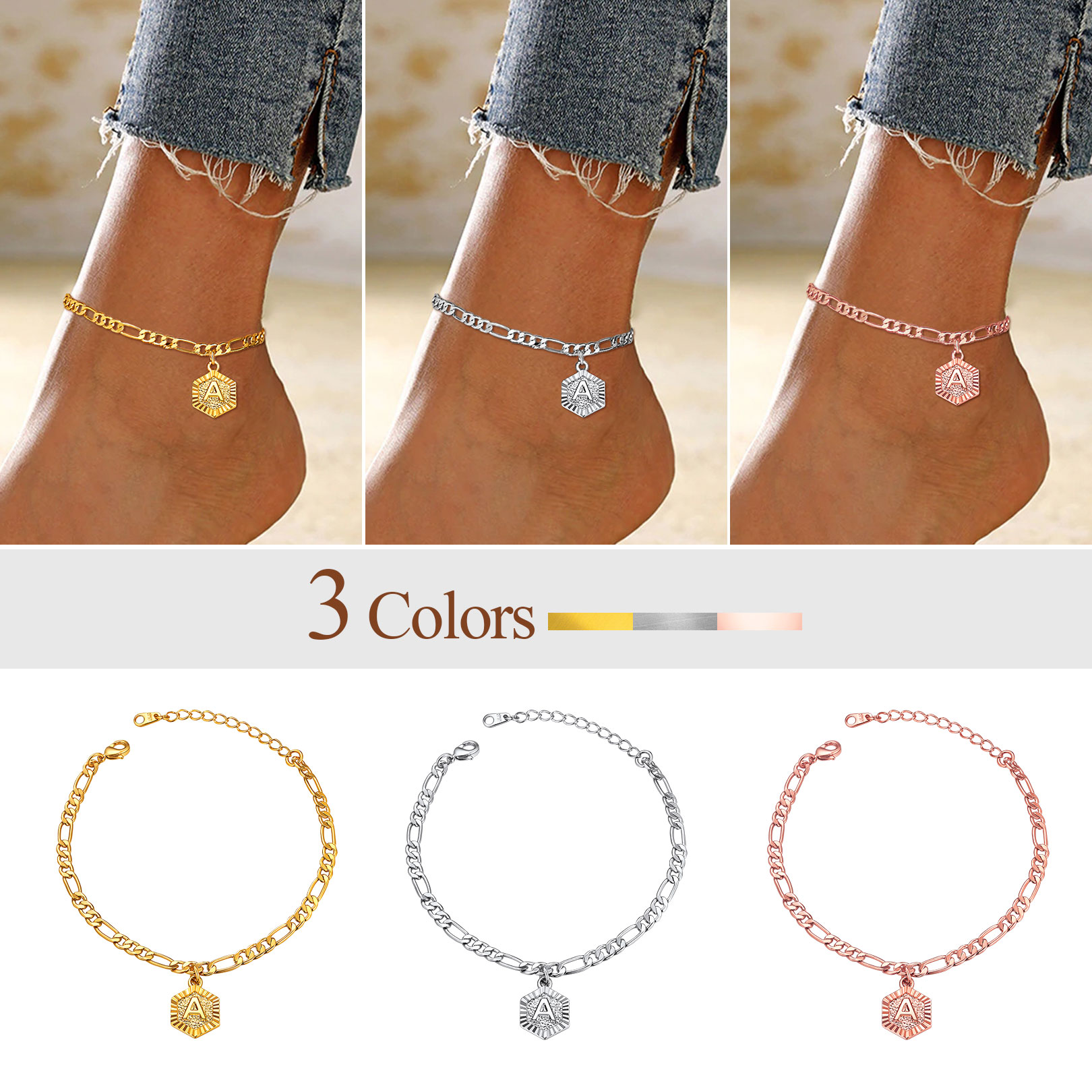 Featuring a stunning Figaro Chain Link design, this adjustable ankle bracelet exudes both durability and elegance. Adorned with a Hexagon Shaped Capital Alphabet Charm, it's dainty, cute and meaningful, making it the perfect piece for everyday wear or special occasions.
